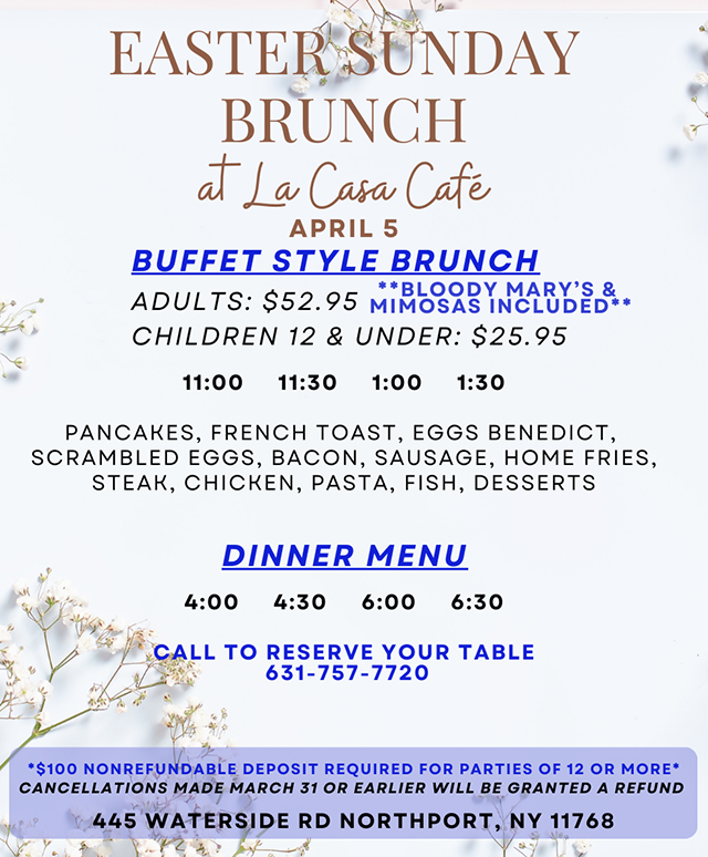 Located on the north shore of Long Island, La Casa Cafe was established in 1993 and is one of the very few restaurants located directly on the beach. Magnificent views of the Long Island Sound and the most beautiful sunsets right at Crab Meadow Beach in Northport New York. The restaurant is newly renovated; now featuring an extended bar area surrounded by five flat screen TV's.